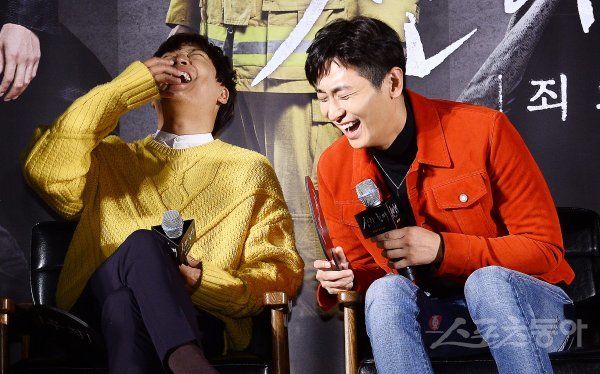 배우 차태현과 주지훈(오른쪽)이 14일 서울 광진구 자양동에 위치한 롯데시네마 건대입구에서 열린 영화 ‘신과 함께’ 제작보고회에 참석해 환하게 웃고 있다.