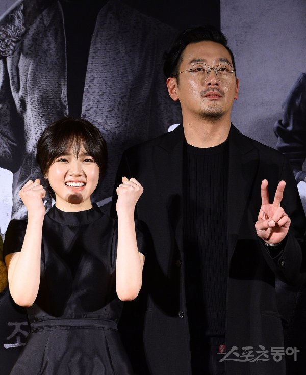 배우 김향기와 하정우(오른쪽)가 14일 서울 광진구 자양동에 위치한 롯데시네마 건대입구에서 열린 영화 ‘신과 함께’ 제작보고회에 참석해 포즈를 취하고 있다.