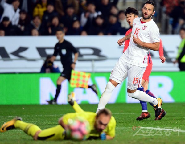 14일 울산 문수월드컵경기장에서 한국과 세르비아의 축구대표팀 평가전 경기가 열렸다. 한국 손흥민이 슛을 날렸으나 골키퍼의 선방에 막히고 있다.