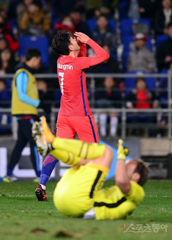 한국 축구 국가대표팀이 14일 울산문수축구경기장에서 세르비아와 평가전을 가졌다. 한국 손흥민이 슛팅을 날린 후 골키퍼에 막히자 아쉬워하고 있다.