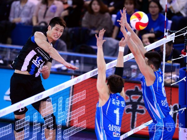 15일 천안 유관순체육관에서 열린 ‘2017-18 도드람 V리그’ 남자부 삼성화재와 현대캐피탈 경기에서 현대캐피탈 문성민이 삼성화재의 블로킹 사이로 스파이크를 날리고 있다.