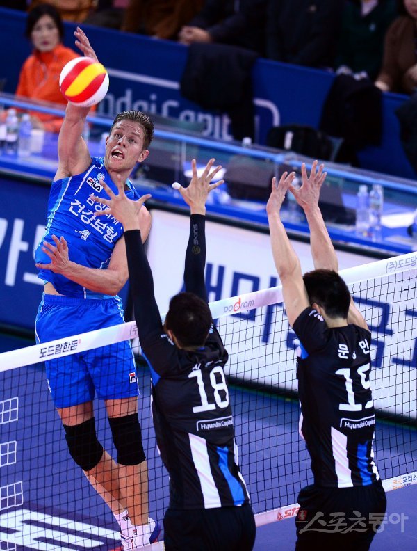 15일 천안 유관순체육관에서 열린 ‘2017-18 도드람 V리그’ 남자부 삼성화재와 현대캐피탈 경기에서 삼성화재 타이스가 현대캐피탈의 블로킹 사이로 스파이크를 날리고 있다.