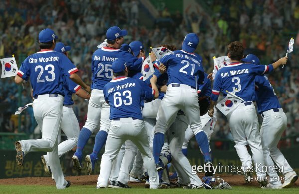 지난 2014년 대만을 꺾고 아시안게임 우승을 차지한 한국야구대표팀. 사진=게티이미지코리아