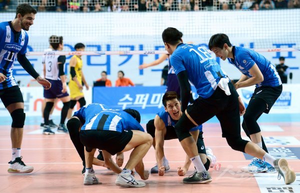 19일 서울 장충체육관에서 ‘2017-18 도드람 V리그’ 남자부 현대캐피탈과 우리카드 경기에서 현대캐피탈 신영석이 서브 득점에 성공하자 문성민이 코트 바닥을 치며 기뻐하고 있다.