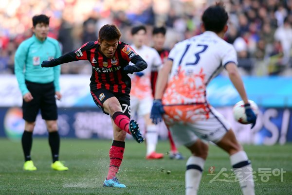 19일 서울 월드컵경기장에서 열린 ‘KEB하나은행 K리그 클래식 2017’ FC 서울과 제주 유나이티드의 경기에서 서울 이명주가 선제골을 날리고 있다.