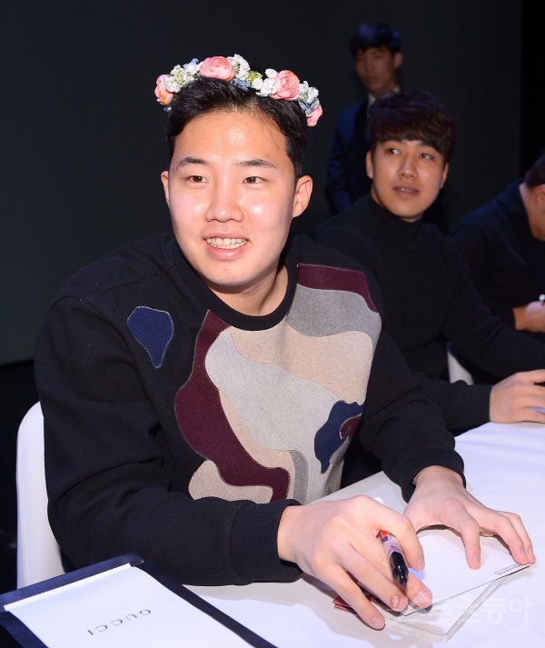 19일 서울 강남구 코엑스 아티움에서 LG트윈스의 ‘러브 기빙 데이(Love Giving Day)’가 열렸다. LG 임찬규가 여성팬에게 선물 받은 화관을 쓰고 카메라를 보며 포즈를 취하고 있다.