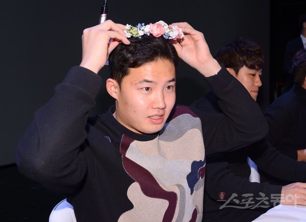 19일 서울 강남구 코엑스 아티움에서 LG트윈스의 ‘러브 기빙 데이(Love Giving Day)’가 열렸다. LG 임찬규가 여성팬이 선물로 준 화관을 모자에 쓰고 있다.