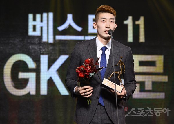 20일 서울 서대문구 홍은동에 위치한 그랜드 힐튼 서울에서 ‘KEB하나은행 K리그 어워즈 2017’이 열렸다. 대구FC 골키퍼 조현우가 K리그 클래식 베스트11 골키퍼 부문을 수상한 후 수감을 밝히고 있다.