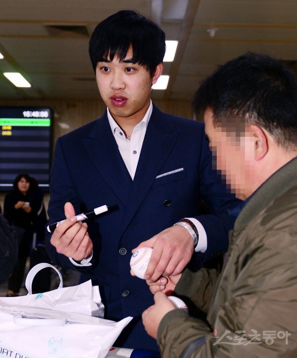 ‘아시아 프로야구 챔피언십(APBC) 2017’ 에서 준우승을 차지한 한국 야구대표팀이 20일 김포공항을 통해 귀국했다. 야구대표팀 임기영이 팬에게 사인을 하고 있다.