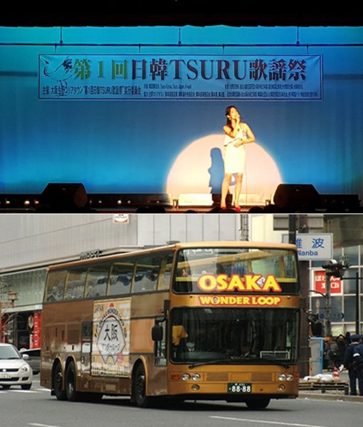 한일 학 가요제에서 열창하고 있는 유자와 카요코 씨(위쪽)-오사카의 명물인 루프버스.
