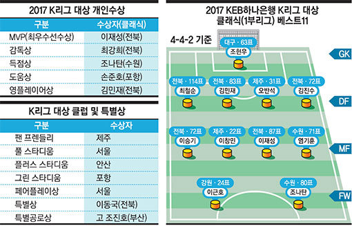 시즌 베스트11에서도 이재성을 포함해 5명을 배출했다. 올 시즌을 앞두고 독일 분데스리가 호펜하임에서 이적한 왼쪽 풀백 김진수(25), 중앙수비 김민재(21), 오른쪽 풀백 최철순(30), 공격형 미드필더 이승기(29)가 전북 천하를 자축했다. 김민재는 영플레이어상도 챙겼다.