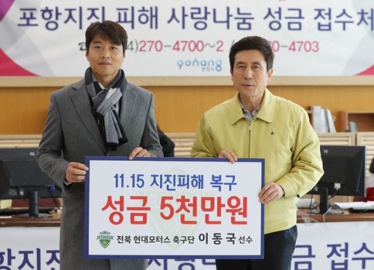 이동국은 20일 오전 고향 포항을 방문해 이강덕 포항시장에게 최근 지진으로 피해를 입은 주민들을 위해 써달라며 5000만원을 기탁했다. 이날 오후 서울에서 진행된 K리그 대상 시상식에 참석하는 대신 예상 못한 자연재해로 힘든 시간을 보내고 있는 고향으로 달려갔다. 포항에서 태어나고 자란 이동국은 포항제철동초∼포항제철중∼포항공고를 거쳐 포항 스틸러스에서 프로에 데뷔했다. 그는 2006년까지 포항의 간판스타로 활약했다.