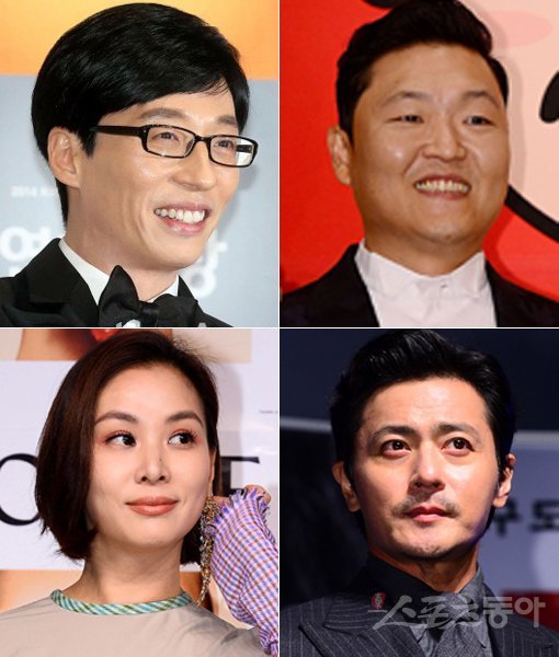 방송인 유재석-가수 싸이-연기자 장동건-고소영(맨 왼쪽위부터 시계방향). 스포츠동아DB·동아닷컴DB