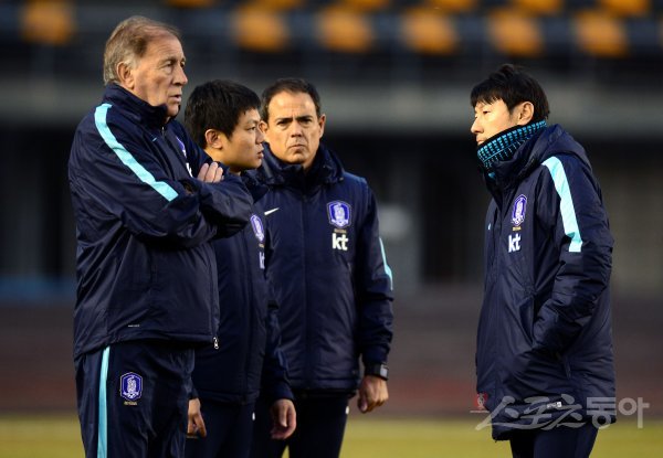 12월 9일부터16일까지 일본 도쿄에서 열리는 ‘2017 동아시아축구연맹(EAFF) E-1 챔피언십(구 동아시안컵)’에 참가하는 한국축구대표팀이 27일 울산 종합운동장에 소집되어 훈련을 가졌다. 축구대표팀 신태용 감독이 코치들과 이야기를 나누고 있다.