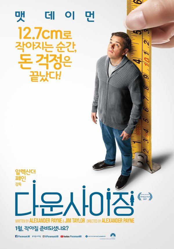 공개된 메인 포스터에는 줄자보다도 작아진 맷 데이먼의 획기적인 비주얼이 눈길을 사로잡는다. 손톱보다도 작은 맷 데이먼의 얼굴과 대비되는 커다란 손가락의 모습은 영화 속에서 다운사이징 시술을 받은 소인들의 세상과 시술을 받지 않은 일반인들의 세상을 어떻게 차별화하여 표현해낼 지 궁금증을 자 아내고 있다. ’12.7cm로 작아지는 순간, 돈 걱정은 끝났다!’라는 카피는 다운사이징 시술이 단순히 사이즈가 작아지는 것이 아니라 그를 통해 무한한 경제적인 이익을 받을 수 있음을 나타내고 있기도 하다.