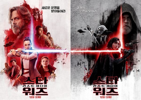 공개된 대결 포스터는 충격적 결말에 대한 비밀의 열쇠를 쥐고 있는 히로인 ‘레이’와 새로운 악으로 부상한 ‘카일로 렌’의 강인한 모습을 담고 있어 눈길을 사로 잡는다. 시리즈 사상 최초로 사용된 영화의 테마 컬러인 붉은색과 절대 악의 압도적 위압감을 돋보이게 한 검은색이 강렬함을 더하며 기대감을 고조시킨다. 특히 유일하게 살아남은 제다이 ‘루크’가 각기 다른 모습으로 두 버전의 포스터에 모두 등장해 영화의 스토리와 어떤 관계를 가지고 있는지 영화 팬들의 궁금증을 자극한다. 여기에 “새로운 운명을 받아들여라”, “과거의 운명을 잊어라”라는 문구는 빛과 어둠의 충돌, 선과 악의 운명을 건 피할 수 없는 전쟁을 예고하며 올 겨울 전 세계를 열광시킬 단 하나의 최강 블록버스터의 탄생을 알린다.