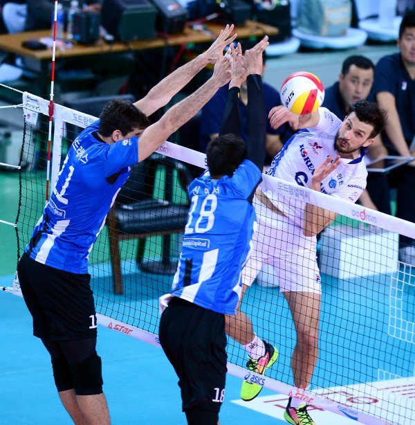 28일 인천 계양체육관에서 열린 ‘2017-18 도드람 V리그’ 남자부 현대캐피탈과 대한항공 경기에서 대한항공 가스파리니가 현대캐피탈의 블로킹 사이로 스파이크 공격을 하고 있다.