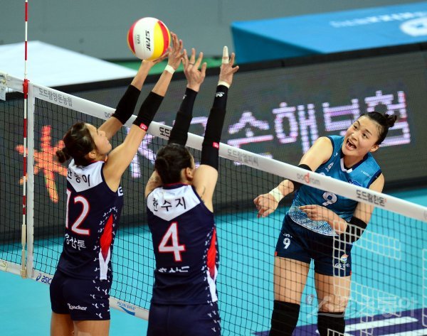 29일 서울 장충체육관에서 열린 ‘2017-18 도드람 V리그’ 여자부 KGC인삼공사와 GS칼텍스 경기에서 GS칼텍스 표승주가 KGC인삼공사의 블로킹 사이로 스파이크 공격을 하고 있다.