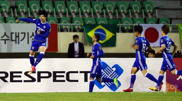 29일 부산 구덕운동장에서 ‘2017 KEB 하나은행 FA CUP’ 부산 아이파크와 울산 현대의 결승 1차전 경기가 열렸다. 울산 김승준이 선제골을 넣은 뒤 주먹을 쥐며 환호하고 있다.