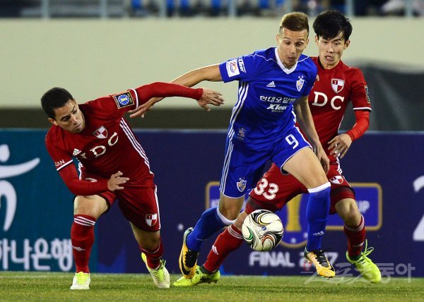 29일 부산 구덕운동장에서 ‘2017 KEB 하나은행 FA CUP’ 부산 아이파크와 울산 현대의 결승 1차전 경기가 열렸다. 울산 오르샤가 부산 호물로의 수비를 제치며 돌파하고 있다.