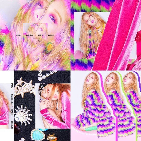 공개된 이미지는 형광색의 화려한 의상을 입은 현아의 모습이 담긴 4장의 사진과 함께 심플한 폰트로 땡스 싱글(Thanx Single) \'Lip & Hip\'의 발매일이 포함되어있다.