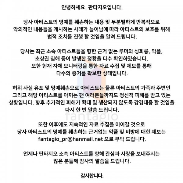또한 이후에도 지속적인 자료 수입을 이어갈 것으로 당사 아티스트의 명예를 훼손하는 근거 없는 악플 및 비방에 대한 제보는 fantagio_pr@hanmail.net으로 부탁 드립니다.