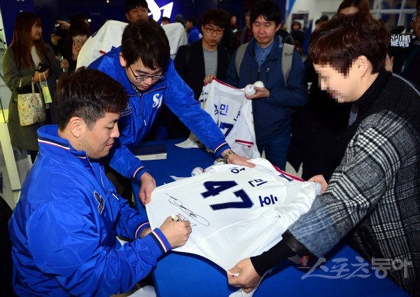 30일 대구 라이온즈파크에서 4년 총액 80억에 FA 계약한 삼성 강민호의 입단식이 열렸다. 강민호가 자신의 이름이 새겨진 유니폼에 사인하고 있다.