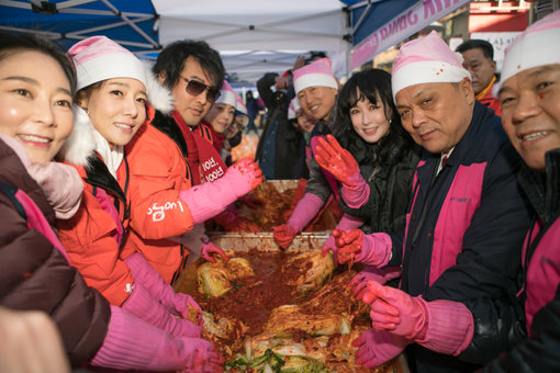 ‘사랑의 김장 나눔’ 행사에 참여하고 있는 가수 적우(오른쪽에서 세 번째)와 배우 김보성(왼쪽에서 세 번째).