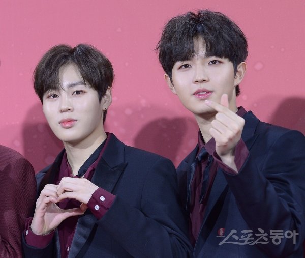 워너원 하성운과 김재환(오른쪽)이 2일 서울 구로구 고척스카이돔에서 열린 ‘카카오미니와 함께 하는 2017 멜론 뮤직 어워드’에서 포즈를 취하고 있다.