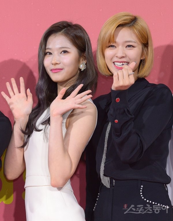 트와이스 사나와 정연(오른쪽)이 2일 서울 구로구 고척스카이돔에서 열린 ‘카카오미니와 함께 하는 2017 멜론 뮤직 어워드’에서 포즈를 취하고 있다.