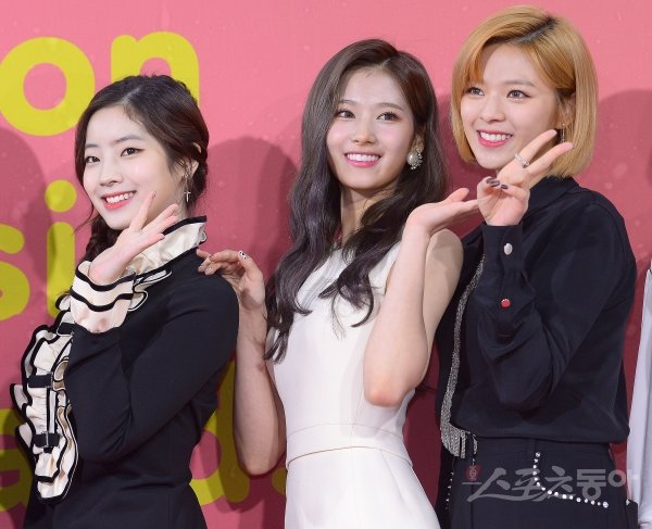 트와이스 다현-사나-정연(왼쪽부터)이 2일 서울 구로구 고척스카이돔에서 열린 ‘카카오미니와 함께 하는 2017 멜론 뮤직 어워드’에서 포즈를 취하고 있다.