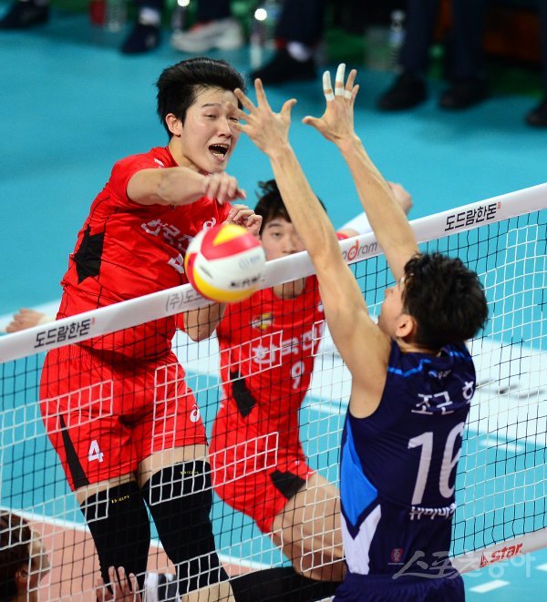 3일 서울 장충체육관에서 열린 ‘2017-18 도드람 V리그’ 남자부 한국전력과 우리카드 경기에서 한국전력 안우재가 우리카드 블로킹 사이로 스파이크를 날리고 있다.