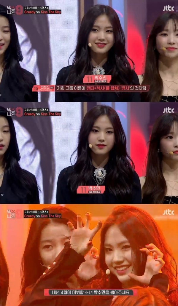 iMe KOREA(아이엠이코리아) 소속 박수민은 3일 방송된 JTBC \'믹스나인\' 댄스 포지션 배틀에서 비주얼 여신으로 시청자들의 시선을 단번에 사로잡았다. 이날 아리아나 그란데의 \'그리디(Greedy)\'로 큐티+섹시 ‘큐시’팀을 결성해 무대에 오른 박수민은 청순하면서도 섹시한 이중적인 매력을 동시에 지닌 극강의 비주얼로 눈길을 끌었다. 무대에서의 유혹적이면서도 강렬한 눈빛과 독보적 댄스실력까지 더해져 보는 이들을 매혹시켰다.