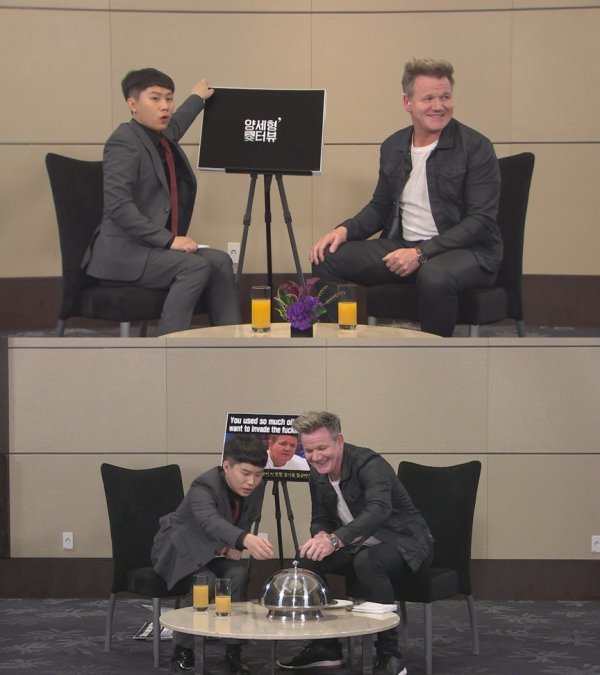 세계적인 스타 셰프의 대세 모바일 프로그램 출연인 만큼, 두 사람의 인터뷰는 지난달 철저한 보안 속에 진행됐다. 헬스 키친, 키친 나이트 메어 등의 프로그램을 진행하며 참가자들의 음식이 마음에 들지 않으면 주방에서 쫓아내거나 거침없는 폭언을 일삼으며 세계적인 인기를 끌고 있는 그가, 웬 일인지 MC 양세형에게 ‘머리스타일이 참 멋지다’는 인사말을 건네며 화기애애한 촬영이 시작됐다.