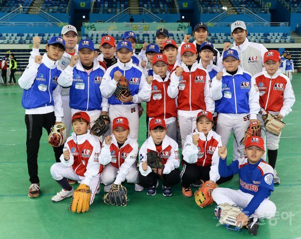 KIA 안치홍과 임기영(오른쪽)이 4일 인천 남동구에 위치한 남동체육관에서 열린 (사)한국프로야구선수협회가 개최한 프로야구 현역 선수와 유소년 학생들이 함께하는 야구클리닉 ‘빛을 나누는 날’ 행사에서 유소년 선수들과 파이팅을 외치고 있다.