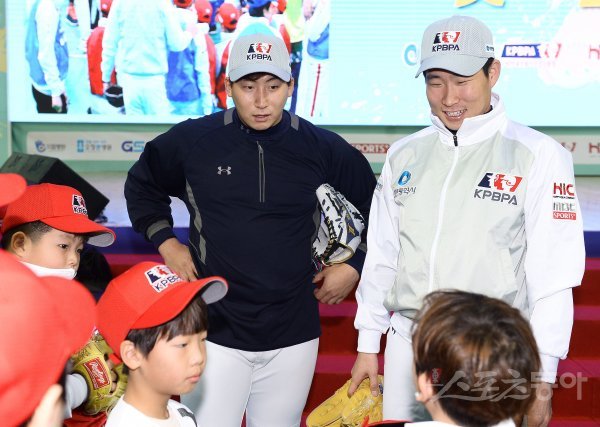 NC 나성범과 이재학(오른쪽)이 4일 인천 남동구에 위치한 남동체육관에서 열린 (사)한국프로야구선수협회가 개최한 프로야구 현역 선수와 유소년 학생들이 함께하는 야구클리닉 ‘빛을 나누는 날’ 행사에서 유소년 선수들에게 지도를 하고 있다.