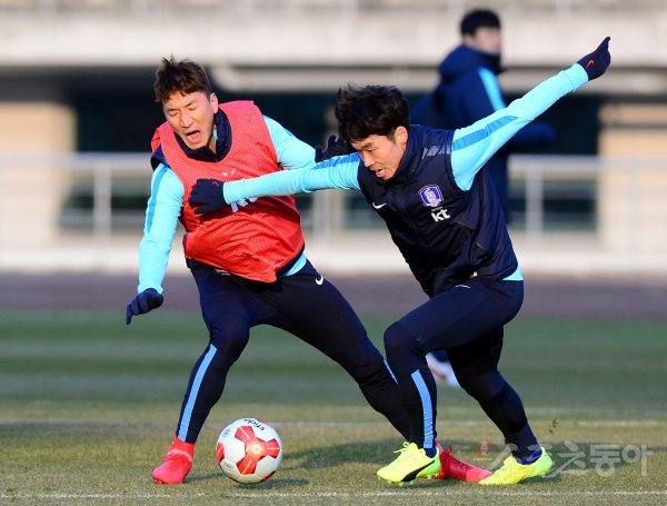 9일부터 16일까지 일본 도쿄에서 열리는 ‘2017 동아시아축구연맹(EAFF) E-1 챔피언십(구 동아시안컵)’에 참가하는 한국축구대표팀이 4일 울산 종합운동장에 소집되어 훈련을 가졌다. 축구대표팀 김성준과 정우영이 패스 훈련을 펼치고 있다.