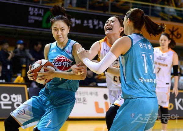 4일 청주실내체육관에서 열린‘신한은행 2017∼2018 여자프로농구‘ KEB하나은행과 KB스타즈 경기에서 KEB하나은행 염윤아가 KB스타즈 김진영에 앞서 리바운드 볼을 잡고 있다.