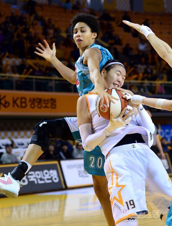 4일 청주실내체육관에서 열린‘신한은행 2017∼2018 여자프로농구‘ KEB하나은행과 KB스타즈 경기에서 KB스타즈 박지수가 KEB하나은행 해리슨에 앞서 리바운드 볼을 잡고 있다.