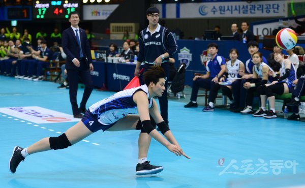 5일 수원실내체육관에서 열린 ‘2017-18 도드람 V리그’ 여자부 IBK기업은행과 현대건설 경기에서 기업은행 김희진이 코트 밖까지 달려가 리시브 하려했으나 실패하고 있다.