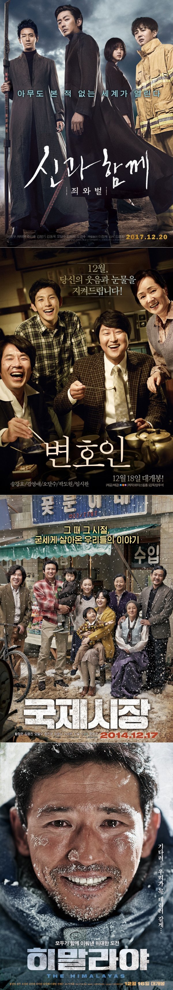 역대 12월 극장가는 가슴을 울리는 따뜻한 감동을 담은 영화가 장악해왔다. 영화 ‘변호인’은 돈 되는 의뢰만 받던 속물 변호사가 생애 처음 돈 대신 사람을 변호하며 변화해가는 과정을 보여주며 1,130만 관객을 웃기고 울리며 2013년 연말 대미를 장식했다. 2014년 12월은 ‘국제시장’의 해였다. ‘국제시장’은 1950년대 격변하는 한국 현대사를 지낸 가장 평범한 한 아버지의 이야기를 통해 전 세대 관객층의 공감대를 형성하며 1,400만 관객을 돌파했다. 2015년 12월에는 히말라야 등반 중 생을 마감한 동료의 시신을 찾기 위해 다시 히말라야로 떠나는 엄홍길 대장과 휴먼원정대의 따스한 도전을 그린 영화 ‘히말라야’가 770만 관객의 가슴을 뜨겁게 적시며 흥행가도를 달렸다.