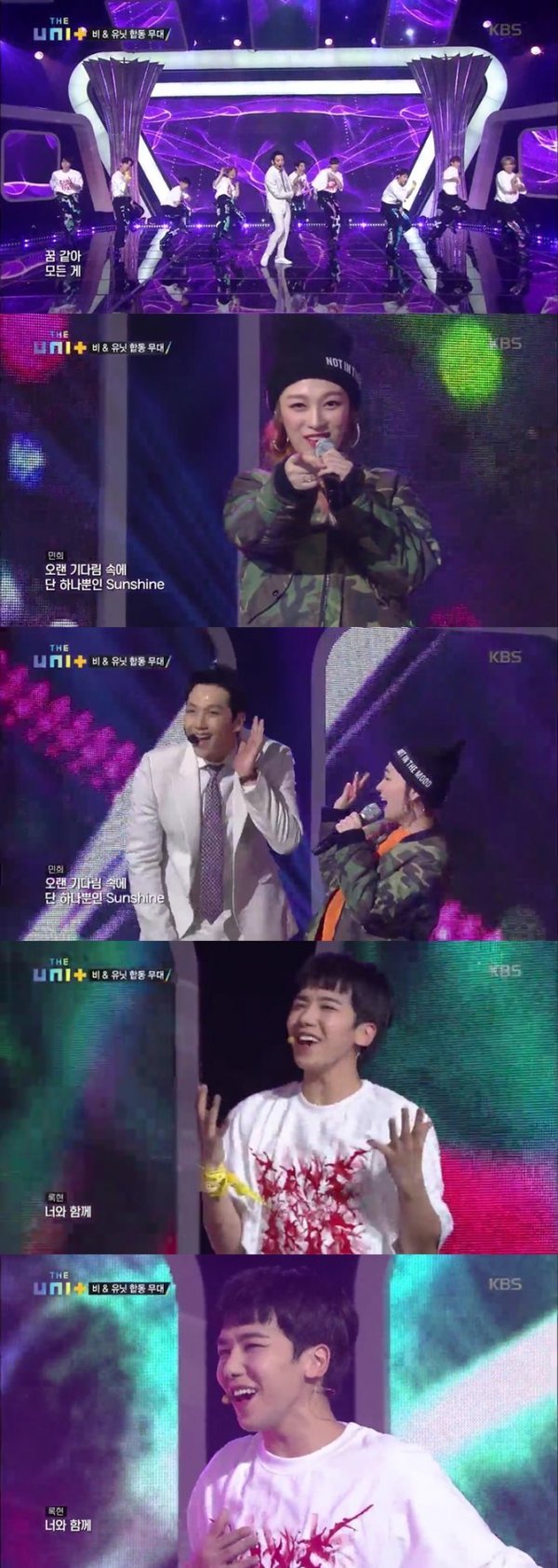 KBS2 ‘더유닛’에 출연 중인 그룹 백퍼센트 록현과 미스에스 강민희가 멘토 비와 합동무대를 펼쳤다.