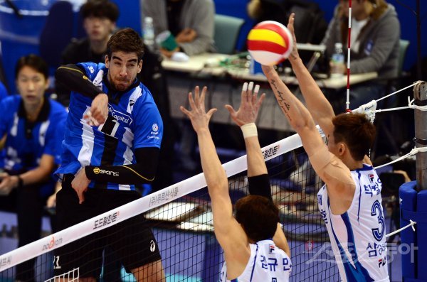 6일 대전 충무체육관에서 ‘2017-2018 도드람 V리그’ 대전 삼성화재와 천안 현대캐피탈의 경기가 열렸다. 현대캐피탈 안드레아스가 삼성화재 블로커를 피해 스파이크를 날리고 있다.