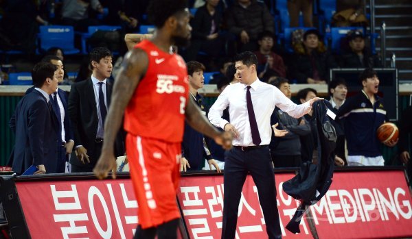6일 잠실학생체육관에서 열린 ‘2017-2018 정관장 프로농구’ 전주KCC와 서울SK 경기에서 KCC 추승균 감독이 판정에 항의하며 양복 상의를 벗어 던지고 있다.
