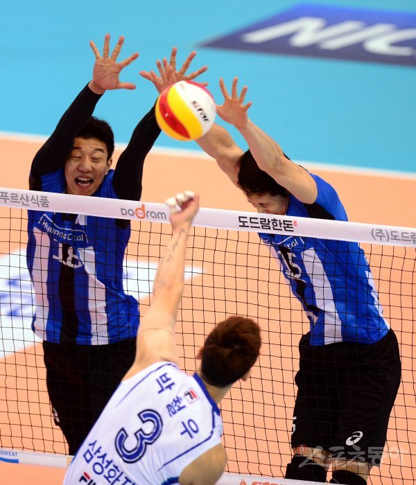6일 대전 충무체육관에서 ‘2017-2018 도드람 V리그’ 대전 삼성화재와 천안 현대캐피탈의 경기가 열렸다. 현대캐피탈 신영석, 문성민이 삼성화재 박철우의 스파이크를 블로킹하고 있다.