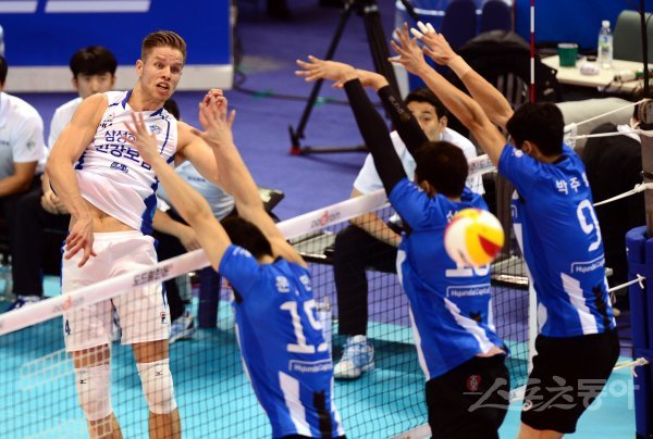 6일 대전 충무체육관에서 ‘2017-2018 도드람 V리그’ 대전 삼성화재와 천안 현대캐피탈의 경기가 열렸다. 삼성화재 타이스가 현대캐피탈 블로커를 피해 스파이크를 날리고 있다.