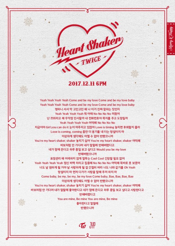 트와이스 리패키지 앨범 \'메리&해피(Merry&Happy)\' 의 타이틀곡 ‘하트 셰이커(Heart Shaker)’의 전체 가사가 공개됐다.
