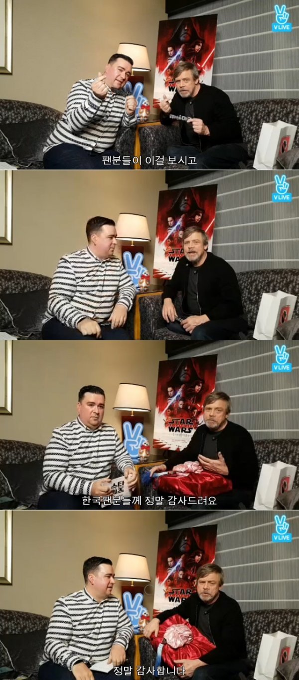 한국에서 날아온 선물을 받은 마크 해밀은 “한국 팬들에게 정말 감사하다”고 인사를 전했다. 그러면서 “어릴 때부터 지금까지 ‘스타워즈’를 봐주고 사랑해주서 감사하다. 우리 영화를 기대해줘서 더욱 감사하다”고 말했다. 샘 해밍턴의 도움을 받아 한국말로 “기대해”라고 말하기도 했다. ‘우주대스타 마크’라는 이름표를 들고 손하트 애교를 선보이는 모습도 인상적이었다.