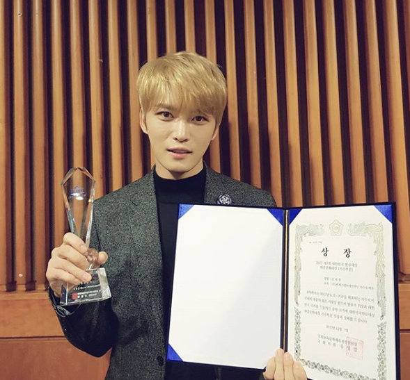 김재중 소속사 씨제스 엔터테인먼트는 7일 “경 김재중 대한민국 한류대상 대중문화대상 수상! 축 상받은 남신보구가쟈~ 오늘이야말로 진정한 혜자데이 #김재중 #KIMJAEJOONG #ジェジュン #金在中 #대한민국한류대상시상식 #대중문화대상 #국회헌정기념관 #팬여러분 #감사합니다 #금발의정석 #트로피보다_빛나 #씨제스타그램 #Congratulations #JaeJoong received an #award from the 7th Korea Wave Awards! #Thank_you_all #cjestagram”라는 멘트와 함께 사진 몇 장을 게재했다.