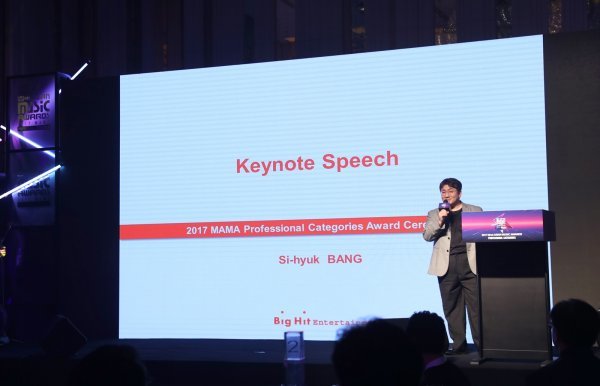 ‘2016 MAMA 전문부문 시상식’에서 베스트 제작자상을 수상한 바 있는 방시혁 빅히트 엔터테인먼트 대표는 올해 ‘2017 MAMA Professional Categories’에 참석해 키노트 스피치를 진행했다. ‘공존’을 주제로 BTS의 성공과 서구 음악시장에 관한 발표를 진행한 방시혁은 “음악을 통해 서로의 다름을 존중하고, 존중을 토대로 기성 미디어와 신규 미디어가 서로에게 영향을 미치며, 대안 문화가 새로운 주류 문화로 떠오를 수 있게 한다는 점에서 공존의 새로운 가능성을 보여준다”며 “지금까지 K-POP 발전을 위해 헌신한 모든 아티스트와 프로듀서 분들의 공로가 BTS가 한 단계 도약하는 데 결정적 역할을 했다. K-POP의 놀라운 성과가 선행되지 않았다면 BTS가 이런 성과를 거둘 수 없었을 것이다. 이 자리를 빌어 감사 드린다”고 전했다.